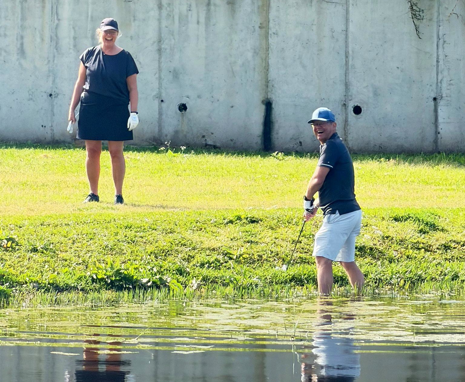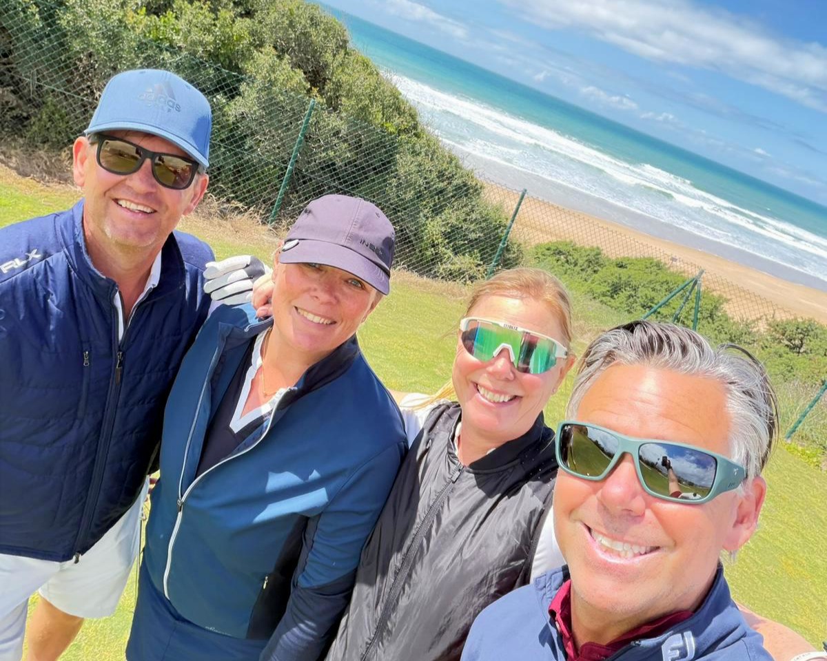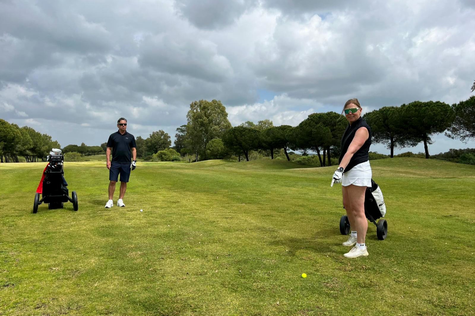 Marika pekar stolt på sin boll efter utslaget när de kan konstatera att hon ”drivit ut” sin Ola (som givetvis jublar på sitt sätt).Hur kan man se så glad ut efter att ha hamnat i vattnet? Tog Robert av sig skorna? Absolut inte! De fick torka i solen resten av rundan. Hur det gick med slaget kan ni se på ”flygande reporterns” film som kommer på slutet.Kommer man bara över buskaget så finns det hyfsat stor plats att landa på.Gänget spelade Real Novo Sancti Petris ”A-bana” och rapporterade givetvis med fina bilder.Hål nr 6, nästan nere på stranden.Utsikt över stranden när man går vidare mot hål 7.Sista prisutdelningen och ”bartömning”. Alla fick pris! Titta vad glada gästerna blev.Förra veckan Marika och Ola. Denna vecka blev Åsa och Robert VECKANS SPELARE och vi sa stort GRATTIS! Vi avslutade på bästa sätt nere på stranden och en nyfunnen restaurang (av klass), VAVA.Hej då, Spanien! Nu åker vi hem och fortsätter träningen.Den sista bilden jag fick på gästerna, Marika, Ola, Åsa och Robert var när de promenerade hem från VAVA, via La Barrosa beach och hem till Al Sur.