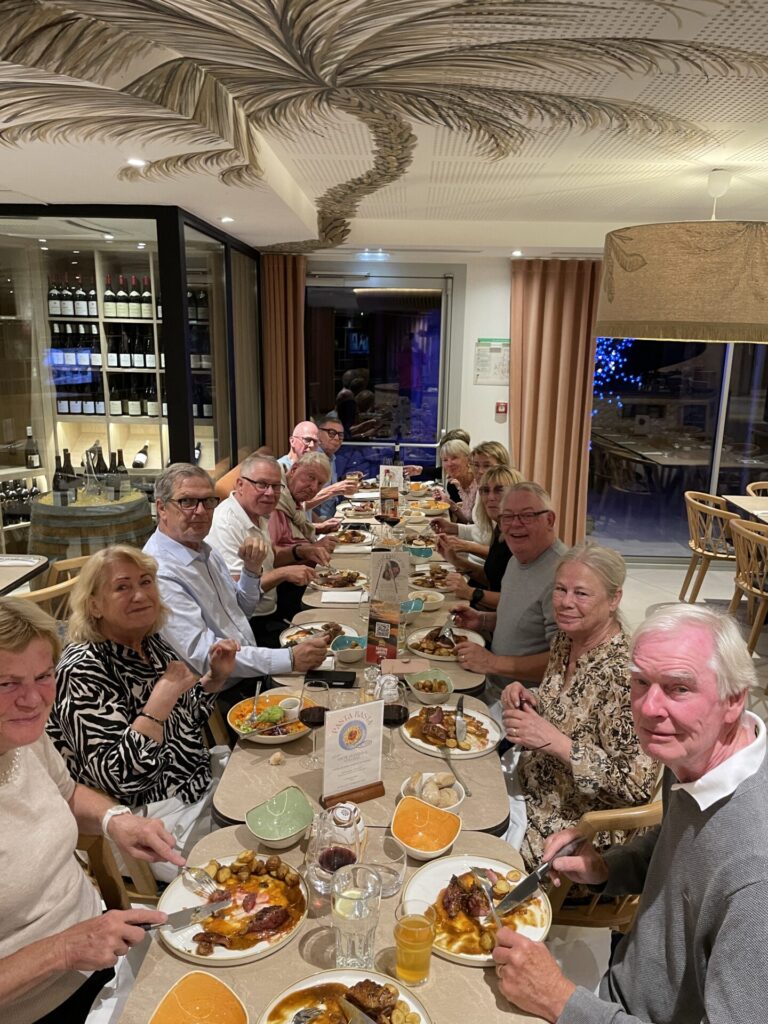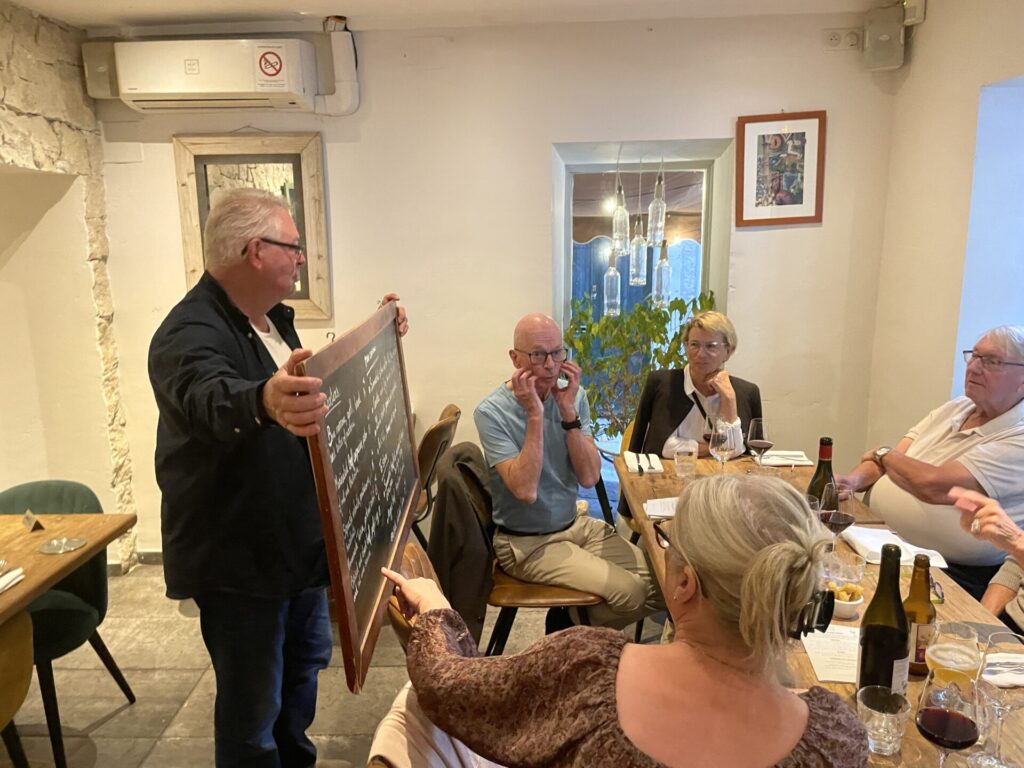 Anders håller i menyn på franska, Stefan visar var ”Joue de boef” sitter, dom andra håller med..