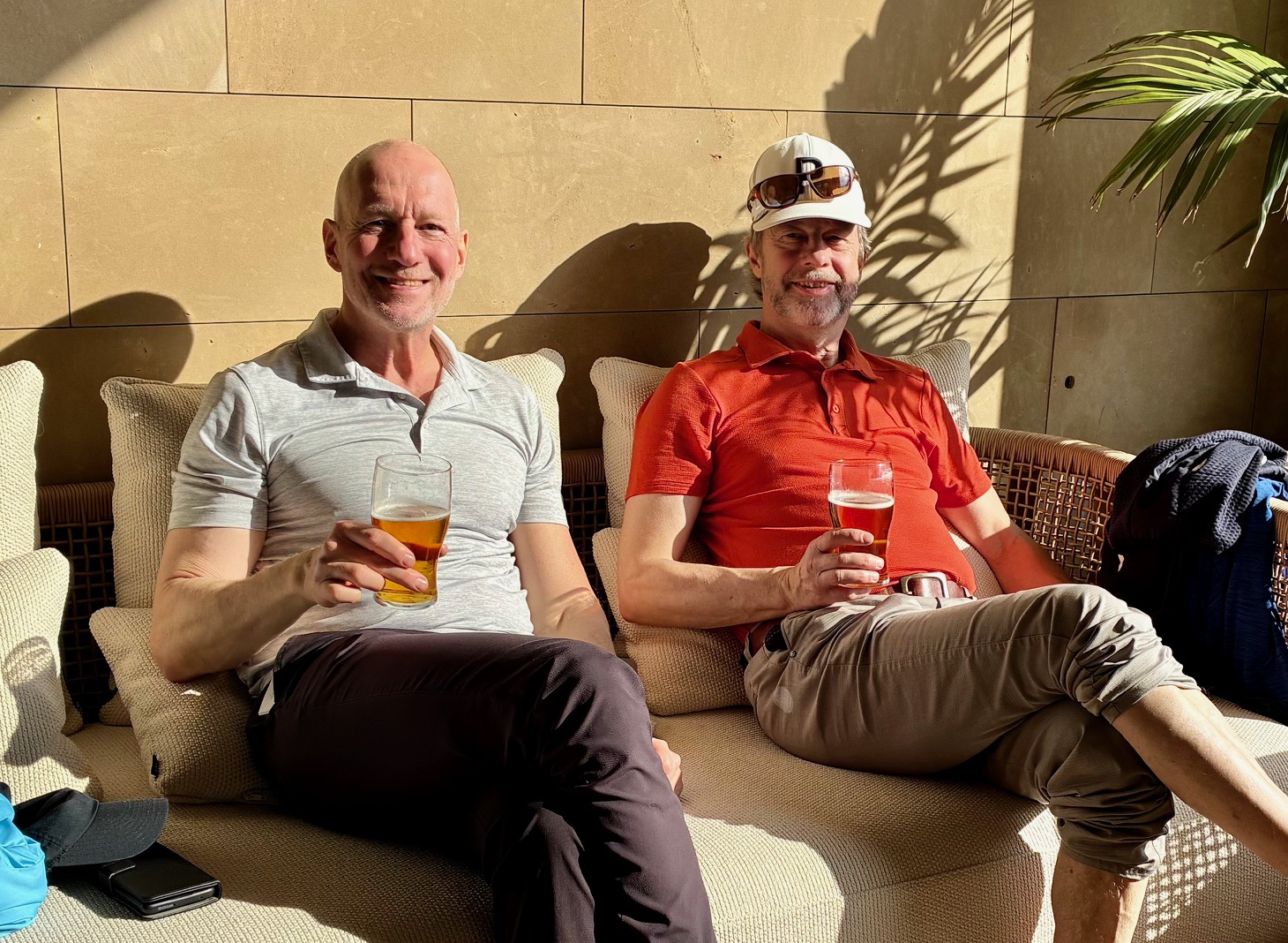 Lasse och Kjell njuter i solen på terassen av en välförtjänt kall Cerveza grande.