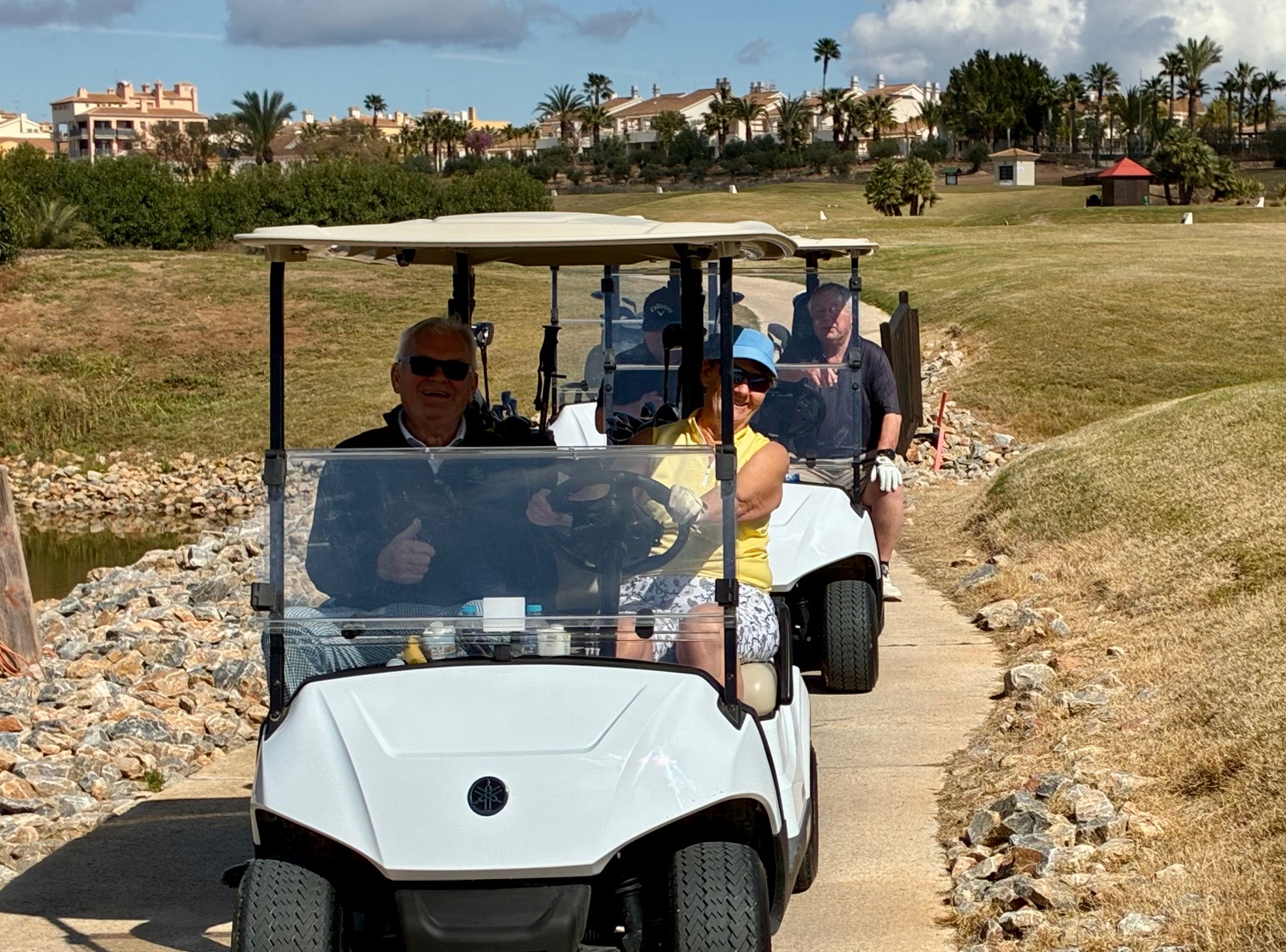 Birgitta och Kenneth var på strålande humör trots att de landat sent på kvällen och tyckte det fungerade toppen med golfbil från tee till green.