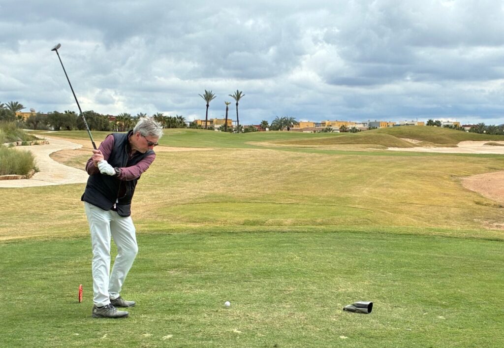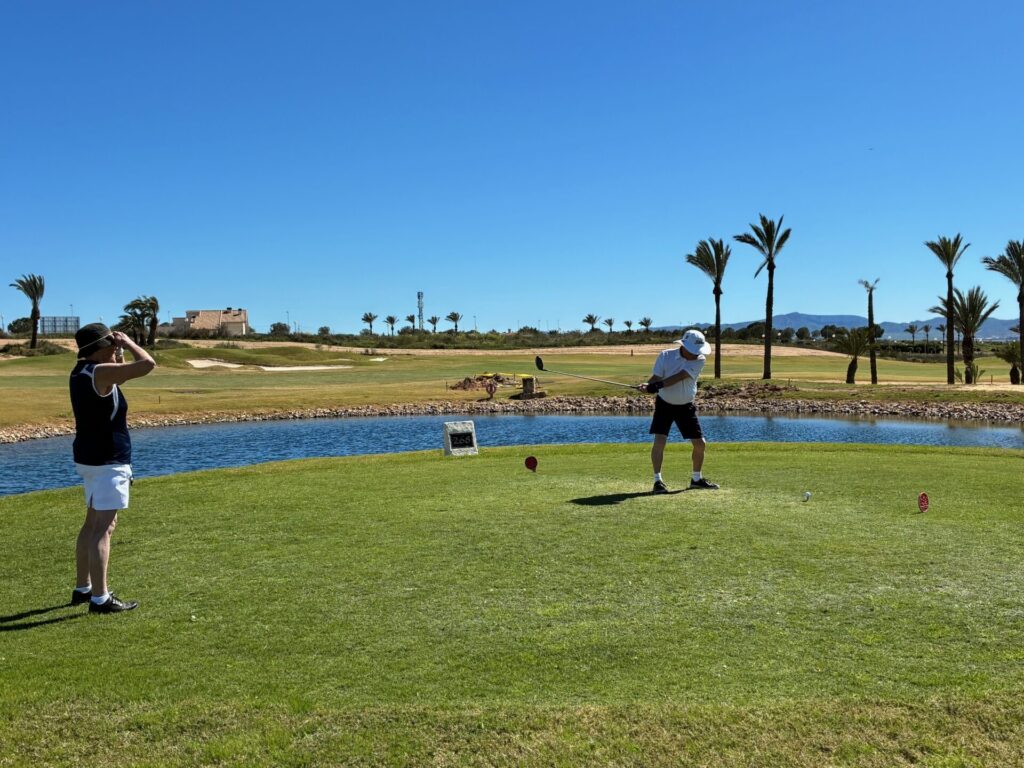 Gustav, som lockat med pappa Patrik på golfresa, slår ut på långa par 3:an över vattnet.