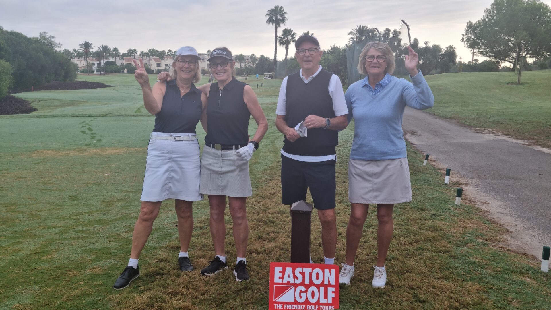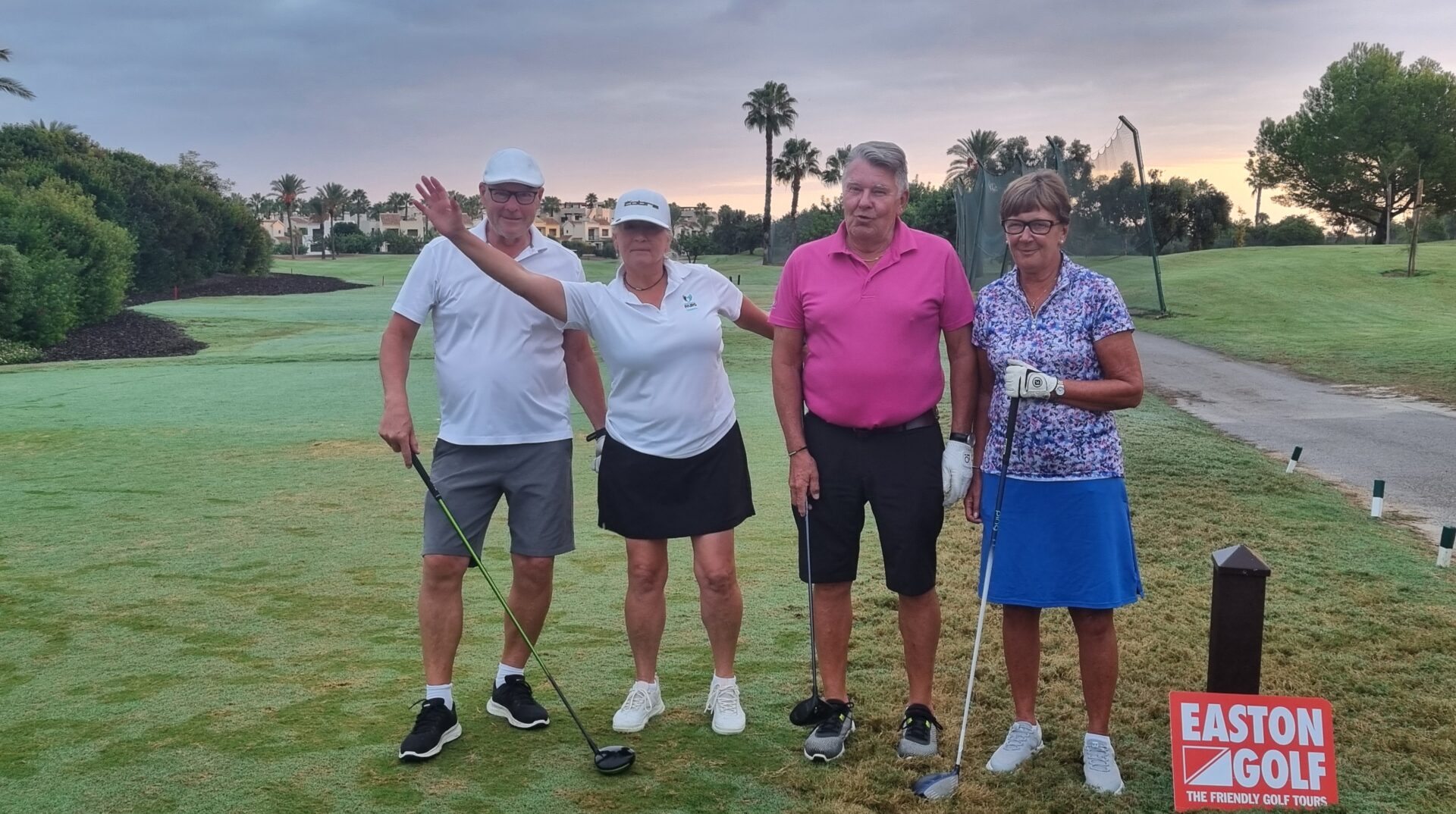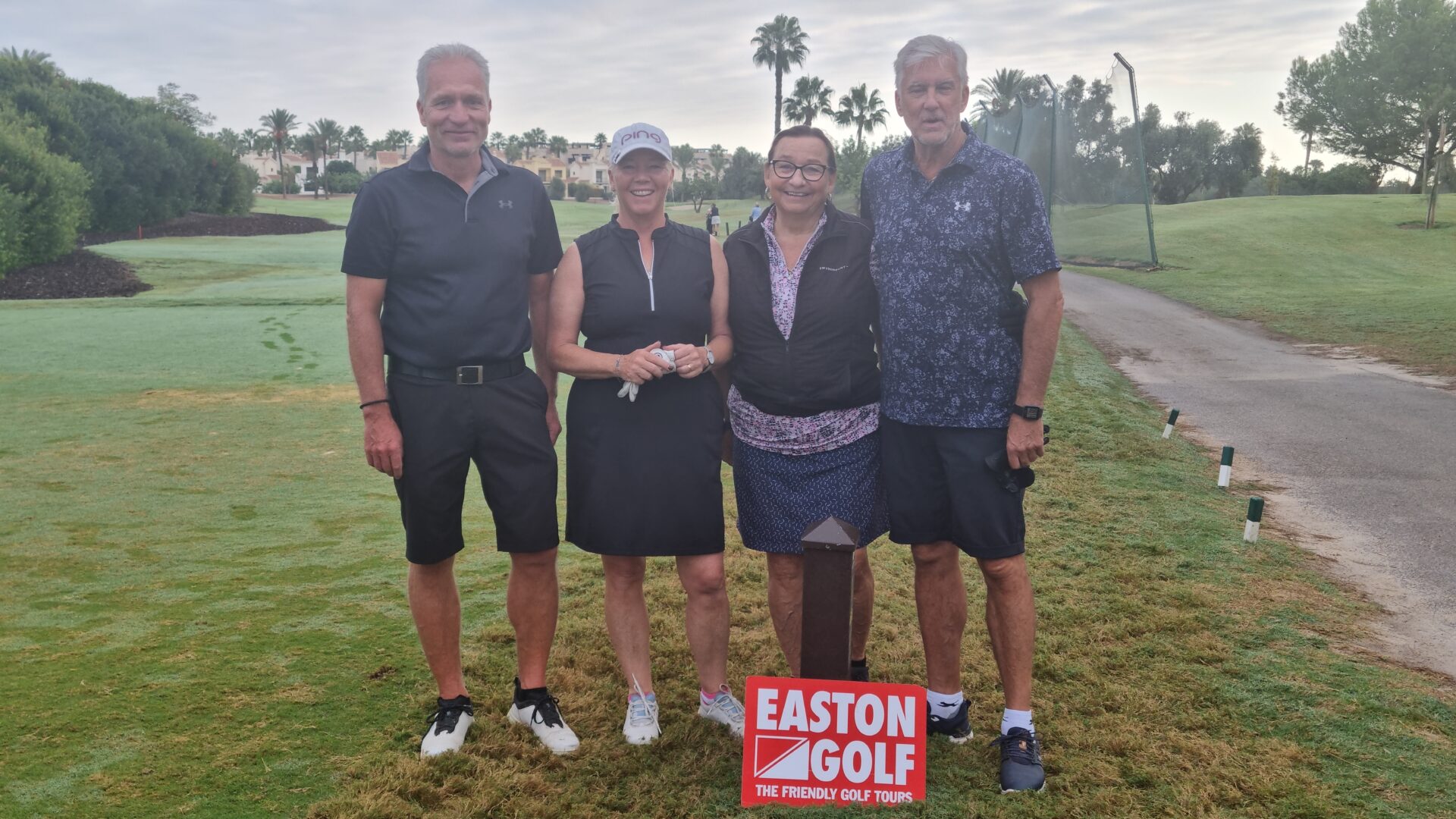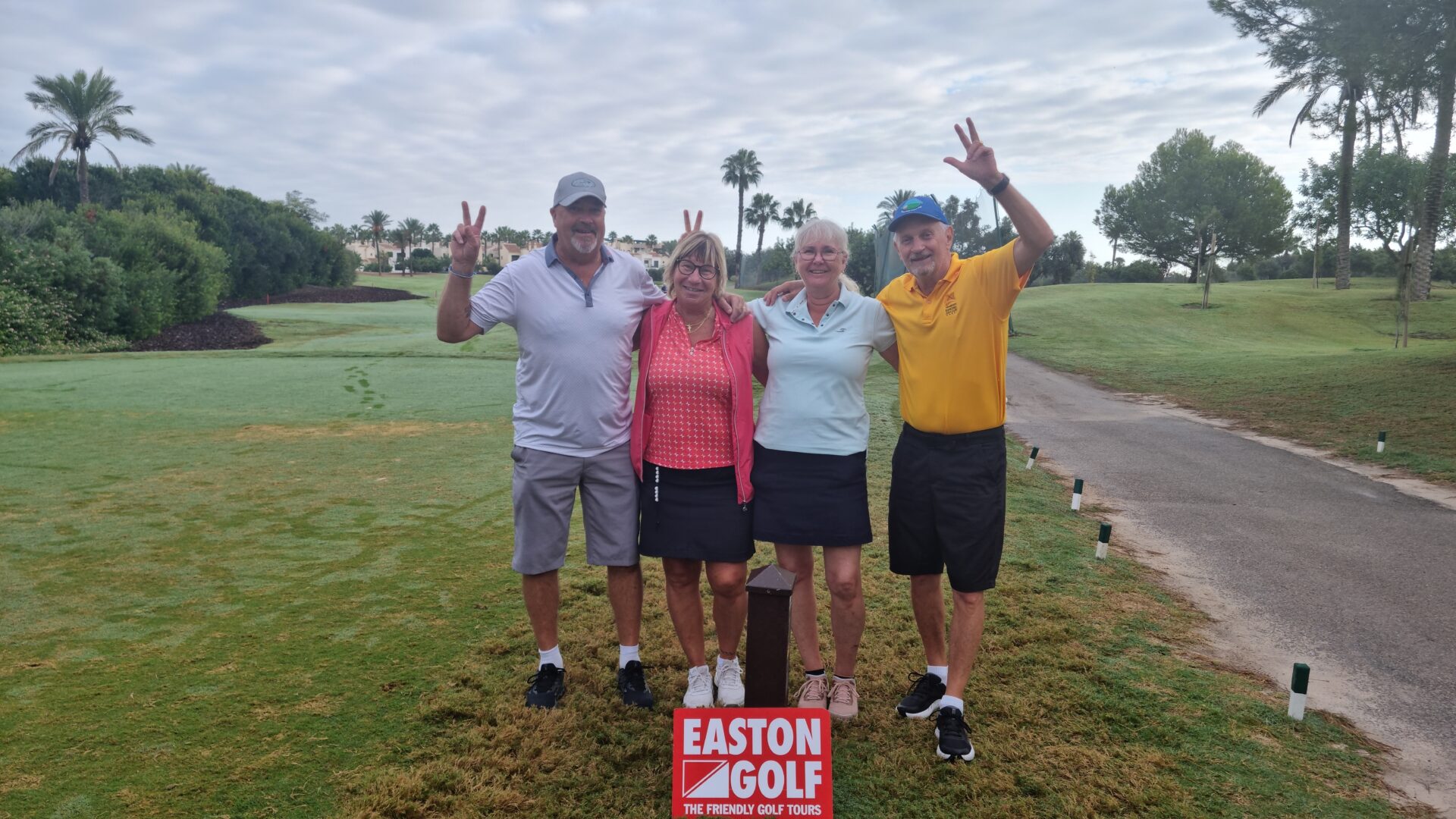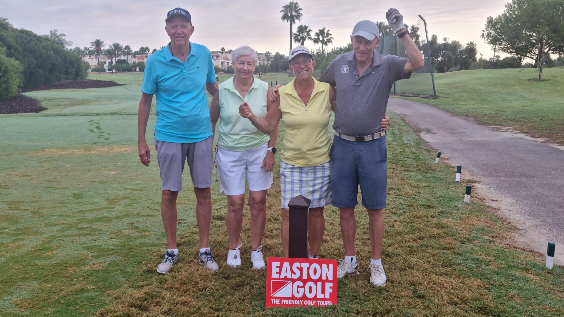 Uppvärmning på Serenas driving range. Ami och Anders ser verkligen till att lägga grunden för en bra runda.Gittan satsar allt på en första bra drive på Serena. Ser ut som du får en bra runda 🙂Dags för partävling på Roda. Let´s dance! Lycka till Anders, Susanne, Bosse och Anita.Två Jan- Olo, med V och F, med sina kära Lena och Angela. Go, Go, Go!Moi Moy med din goa spelpartner Lars-Thonny (LT). Blir en härlig runda tillsammans med Gunnar och Britta.Christer, Karin, Eva och Peter ser fram emot att tillbringa 4,5 timmar tillsammans.De tre damerna Lena, Gittan och Gunilla ser fram emot en trivsam runda med tuppen Hasse.Två spända par inför dagens tävling. Kör hårt Anders, Ami, Anja och Bengt!Peggad och klar 🙂Micke, Carina, Anneli och Janne har bestämt sig. Vi ska bli etta och tvåa i dagens tävling.Eastonvärden stöttade sista paret ut. Ha en bra runda Thomas och Anita!Palmfrukterna hänger vackert efter 18è green.Grattis till Easton Classic vinsten, lag Anneli, Christer, Karin och Janne! Era gemensamma 88 poäng räckte gott och väl till vinst.Ami och Anders skiner i solen med sina Golfamorekort efter Bästbollvinsten. Grattis!Veckans Spelare Christer från Destino de Sol och Ami från Hotel Atrio del Mar visar glatt upp sina värdecheckar till publiken. Ett stort GRATTIS!