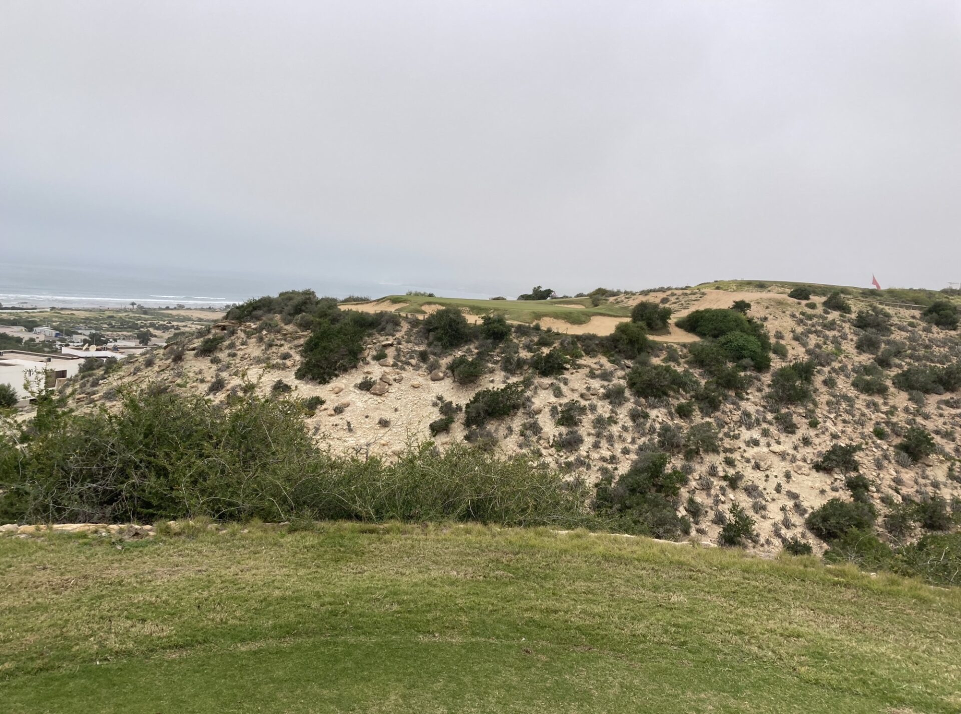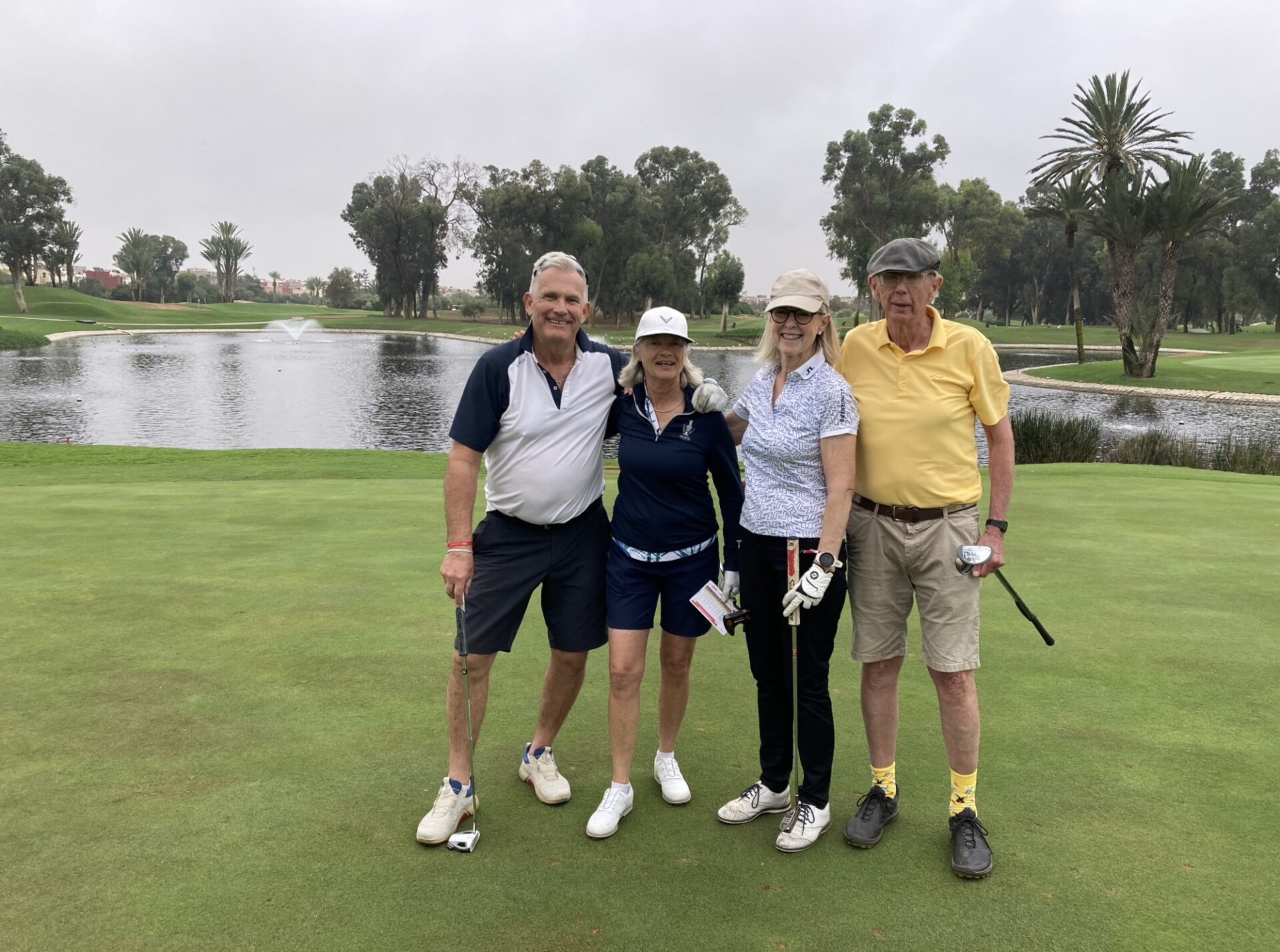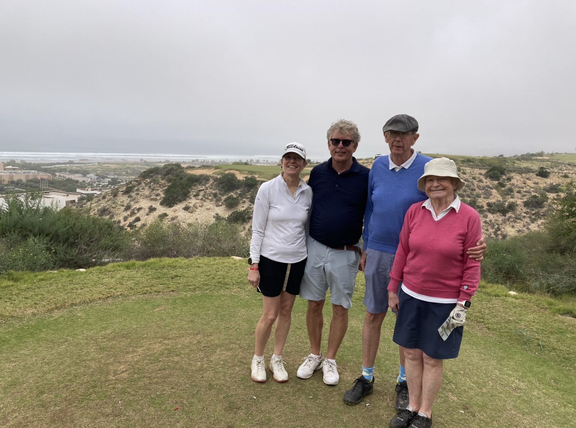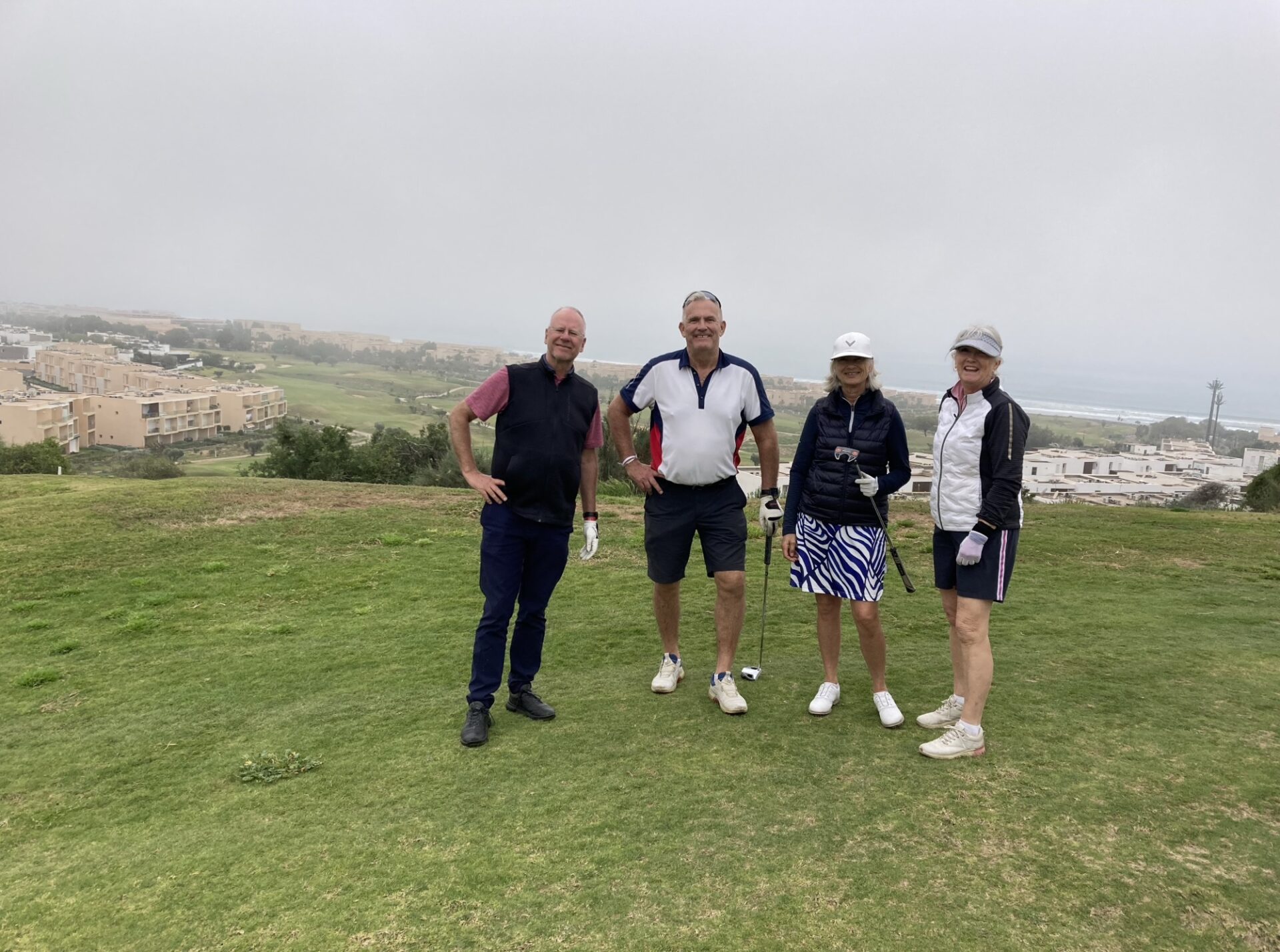 Onsdagen på Tazagzout golf började med nytvättade bilar till alla och tät dimma. Starten fick skjutas på en timme ca. Men sedan kom vi iväg.Banans 17:e hål på denna ”Arizona bana” är en par 3 man slå från ravin till ravin längd från gul 132 meter. Ett spännande hål där vinden ibland är med eller emot spelarna!Och där har vi lite spelare på nämnda hål. Viktoria, Anders, Ville och Ulrika. Hur var de nu kom ni över? Jodå lite sand i vägen bara.På hål 16 hittade vid Peter, Hasse, Maria och Mona. Nere i dalen skymtar banans fina 9 hålare väl värt ett besök.Det så för Marocko viktiga ARGAN-träden växer överallt på banan sedan urminnes tider. Det är tidig vår härnere det blommar lite här och var på banan i olika färger.