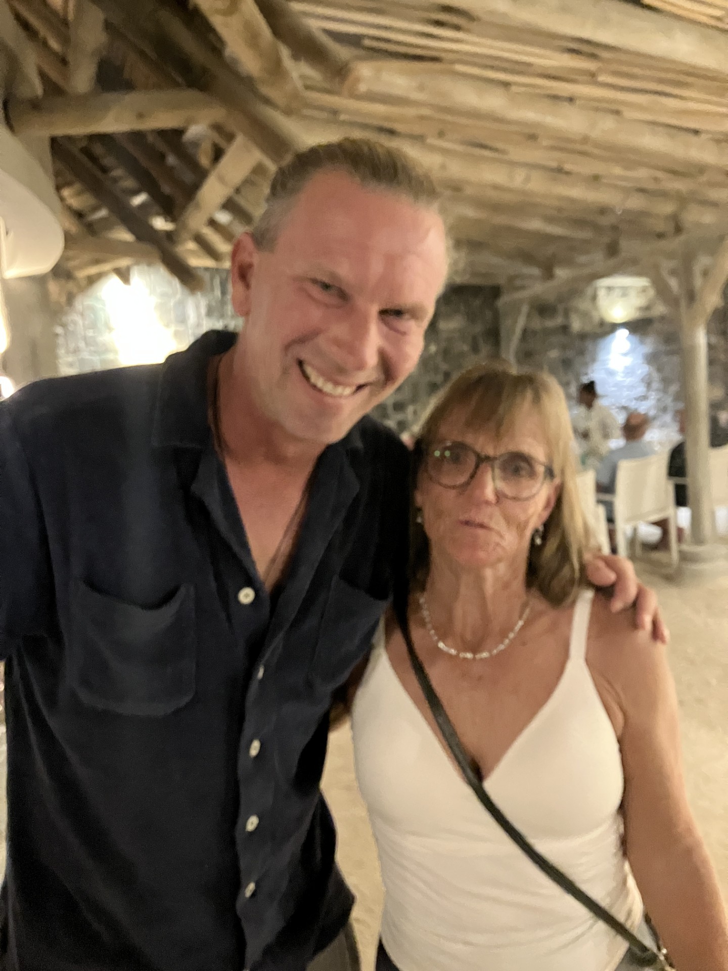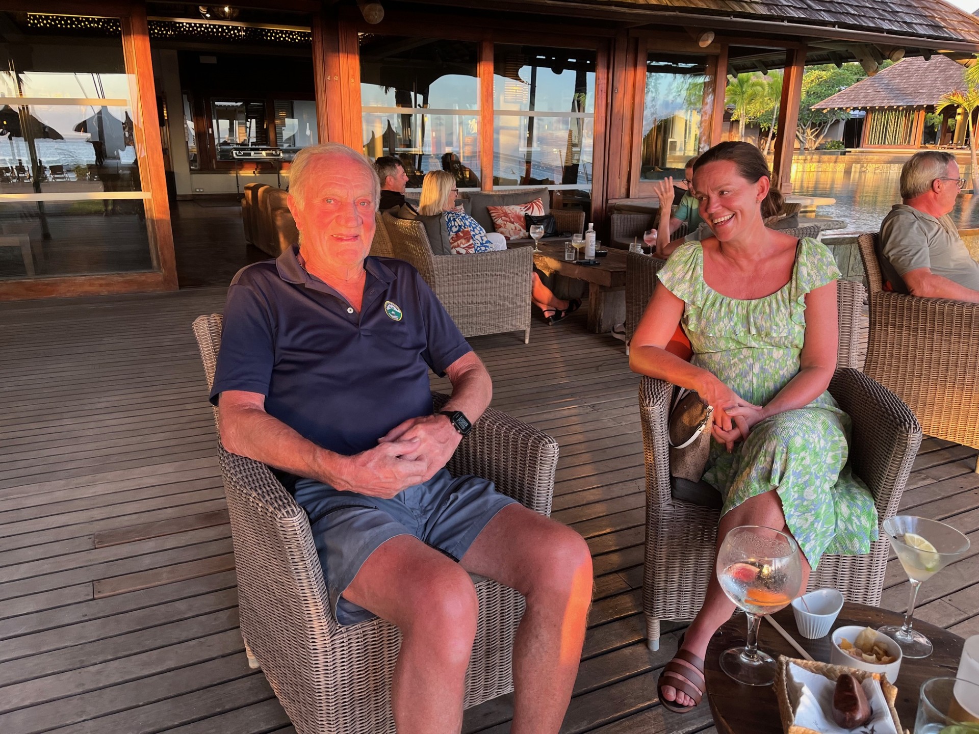 Med utsikt över havet sitter Bosse och Anna och myser med en drink i solnedgången