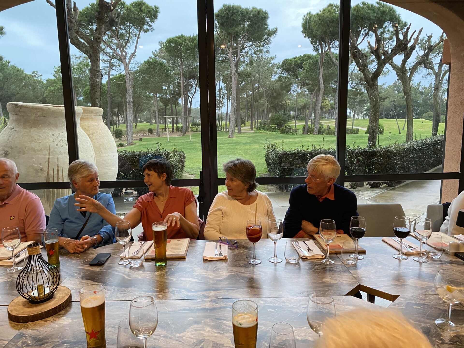 Vid matbordet så visar Harriet Martina hur hennes golfslag går spikrakt. Eva och Göran till höger vill också ta del av denna kunskap.
