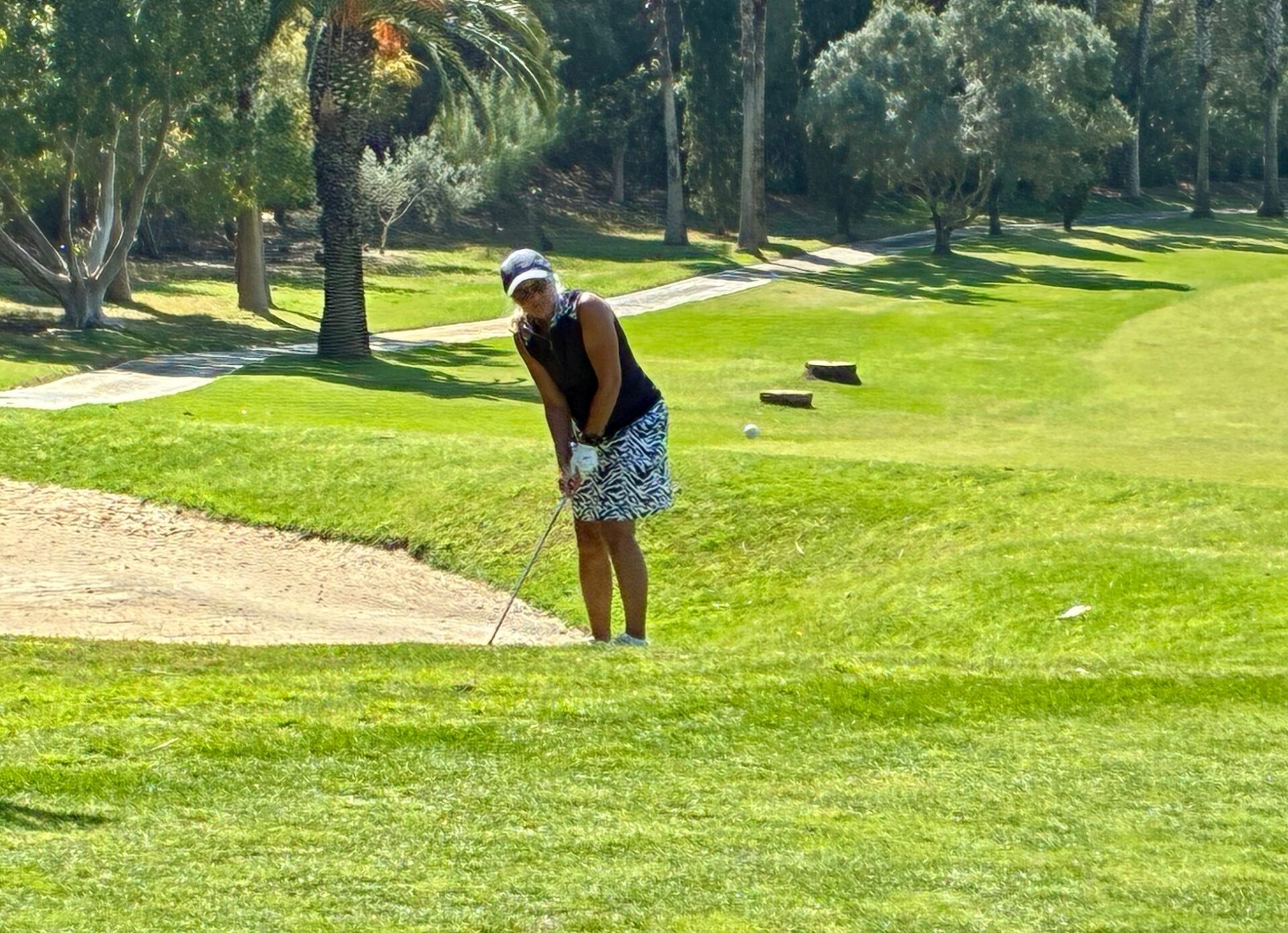 Elvy lyckades bäst och med fint spel hela veckan blev hon Veckans Spelare – grattis! Här i vid bunkerkanten av green på det utmanande sista hålet, så klart en lång par 5.