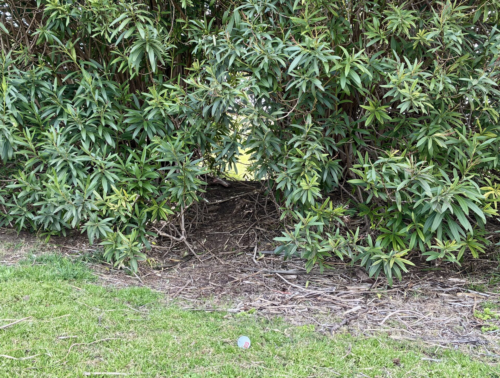 Min boll, med Eastonlogo :-), hittade hålet genom den stora busken!