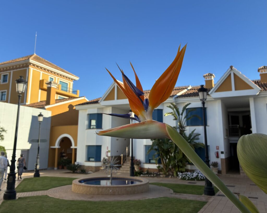 En vacker papegojblomma hade slagit ut utanför mitt rum när jag kom tillbaka till Campoamor efter veckorna på Hacienda del Alamo. Dags att ladda om och träffa nya trevliga Eastongäster!