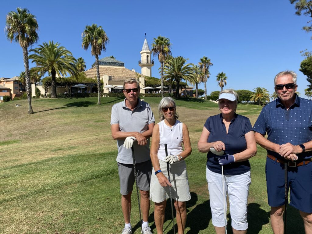 Här ser ni från vänster Bo, Gull-Britt, Siv och Bo-Ragnar. De skall spela den mycket uppskattade blå slingan. Det pratades om hcp-sänkning.