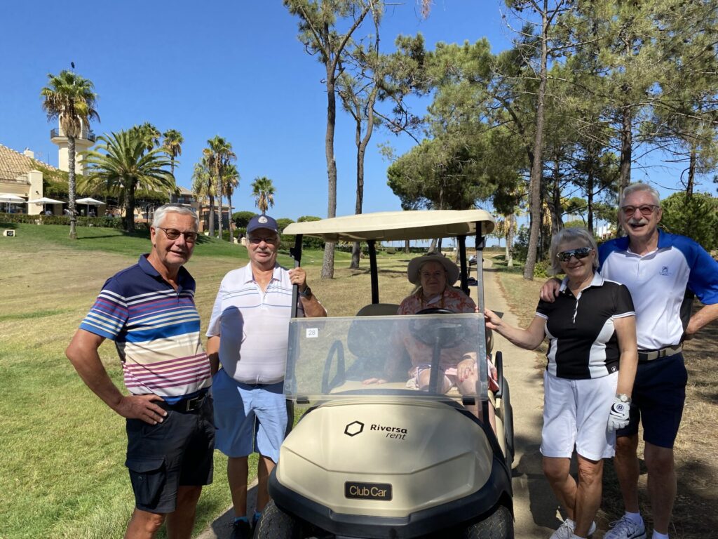 Nu är det dags igen att visa sin styrka på golfbanan. Ni ser från vänster Åke, Hans -Olof, Hans- Olofs caddie Anne, Ammi och Björn