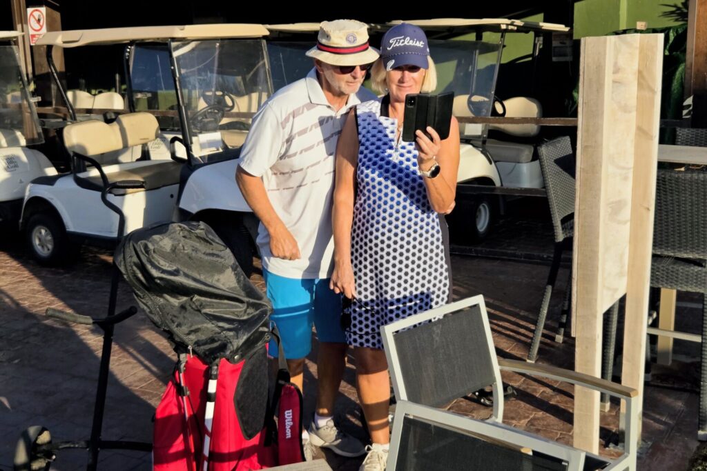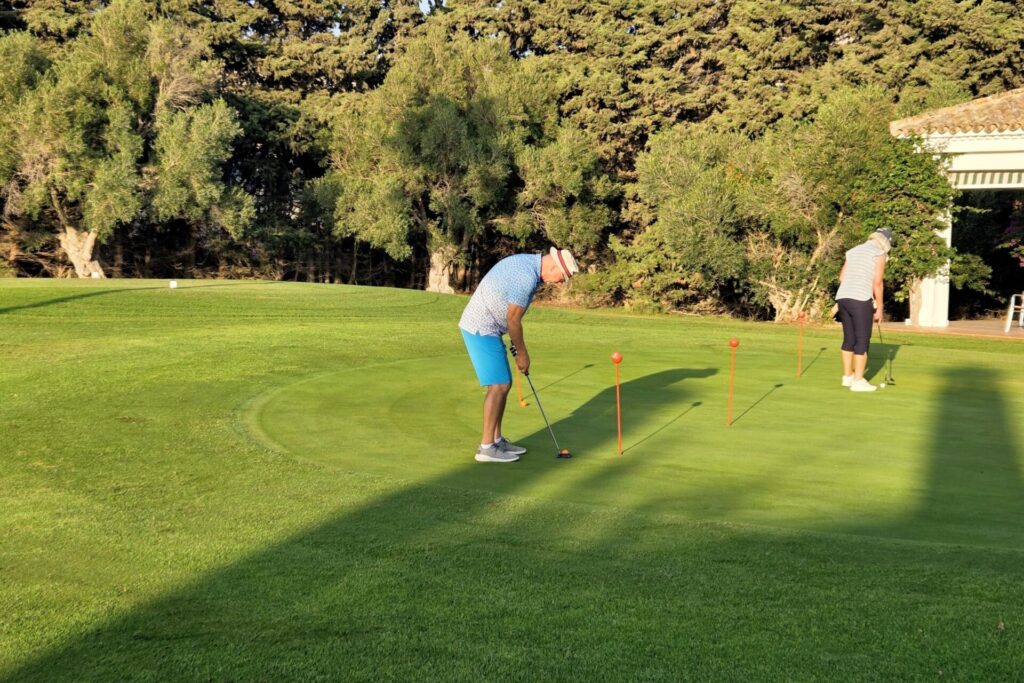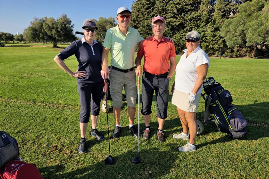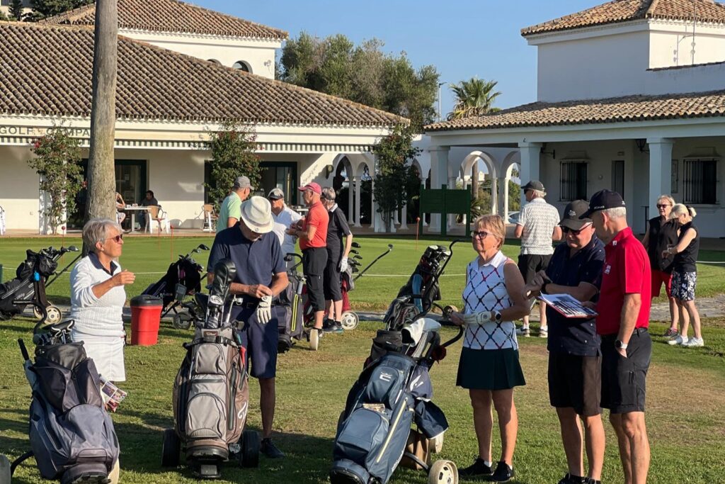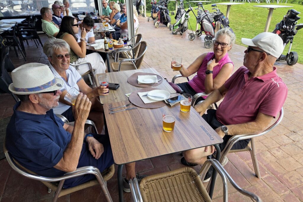 Kalle, vår sociala-medier-guru, har kommit ner på besök. En glad prick som förgyller tillvaron (eller vad säger Du, Pelle?) och ser till att vi får fantastiska bilder och filmer till våra mediekanaler.De som varit här en vecka minglar tillsammans med de nyanlända på Campano.Lars och Karina visade vägen för sitt spelsällskap Richard och Sylvi.Hans och Britt-Mari tillsammans med Mona och Thorbjörn. Linslusen är givetvis Kalle.Kompisgänget antog utmaningen tillsammans. Annmarie, Janne, Pelle och Ann-Marie.På fredagskvällen, efter rundan på Campano, intog vi Saint Patrick´s Tavern för fotboll. Heja, Sverige! Och så behöver vi inte prata mer om det …När man är på resande fot är det viktigt, och uppskattat, att hålla kontakt med dem där hemma. Vad gjorde vi utan internet? Ingo och Birgitta pratar med barn och barnbarn kan jag tänka mig.Armar bakåt sträck! På en bana (Sancti Petri Hills) utan driving-range och övningsområde är det mer fokus på uppvärmning.Sancti Petri Hills första hål. En hel del vatten mellan de små omgivande kullarna och det gäller att utnyttja sina järnklubbor väl. I övrigt är banan ganska platt trots namnet.Lika viktigt är det med den sociala avslappningen efter rundan. Hans, Britt-Marie, Sylvi och Richard njuter.Dags för gemensam middag på lördagskvällen. Atenas Playa stod på programmet och det var ett öronbedövande och sagolikt välkomnande. Liveband och solnedgång. Kalle passade på, tillsammans med gästerna, att hitta den perfekta bilden.