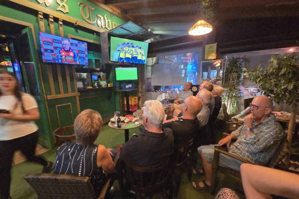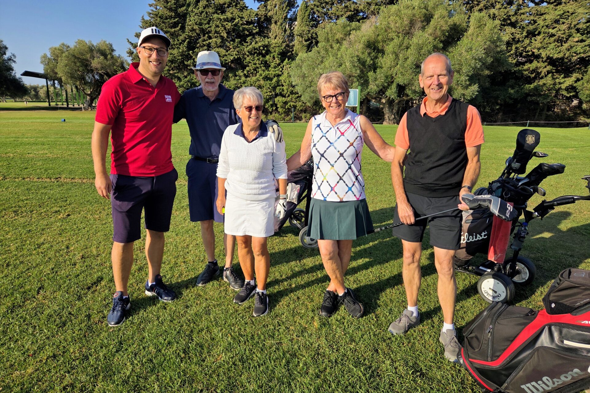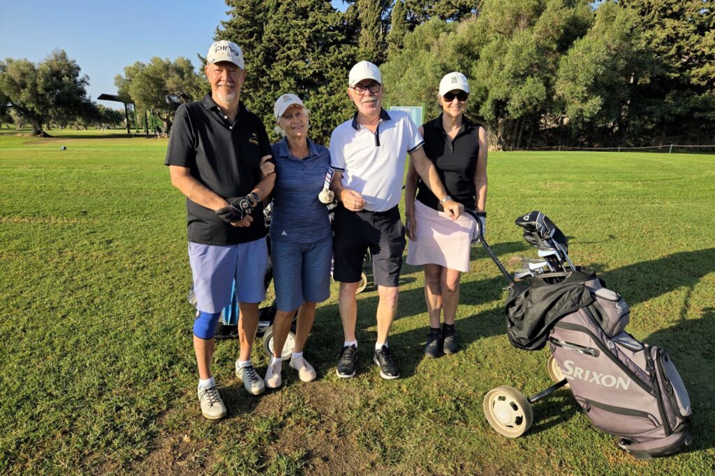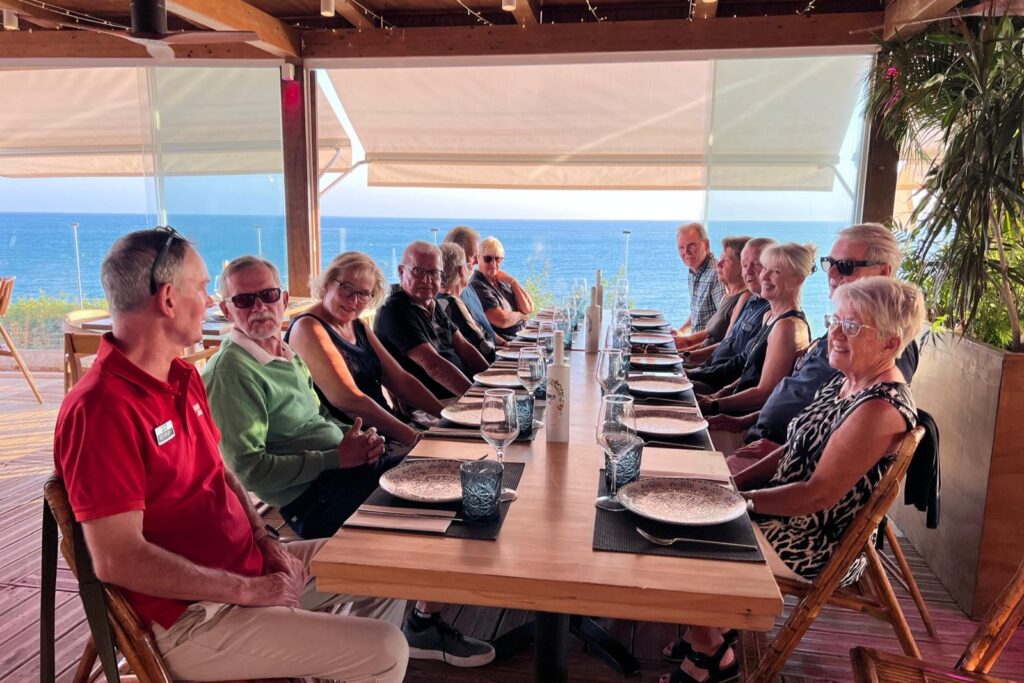 Kalle, vår sociala-medier-guru, har kommit ner på besök. En glad prick som förgyller tillvaron (eller vad säger Du, Pelle?) och ser till att vi får fantastiska bilder och filmer till våra mediekanaler.De som varit här en vecka minglar tillsammans med de nyanlända på Campano.Lars och Karina visade vägen för sitt spelsällskap Richard och Sylvi.Hans och Britt-Mari tillsammans med Mona och Thorbjörn. Linslusen är givetvis Kalle.Kompisgänget antog utmaningen tillsammans. Annmarie, Janne, Pelle och Ann-Marie.På fredagskvällen, efter rundan på Campano, intog vi Saint Patrick´s Tavern för fotboll. Heja, Sverige! Och så behöver vi inte prata mer om det …När man är på resande fot är det viktigt, och uppskattat, att hålla kontakt med dem där hemma. Vad gjorde vi utan internet? Ingo och Birgitta pratar med barn och barnbarn kan jag tänka mig.Armar bakåt sträck! På en bana (Sancti Petri Hills) utan driving-range och övningsområde är det mer fokus på uppvärmning.Sancti Petri Hills första hål. En hel del vatten mellan de små omgivande kullarna och det gäller att utnyttja sina järnklubbor väl. I övrigt är banan ganska platt trots namnet.Lika viktigt är det med den sociala avslappningen efter rundan. Hans, Britt-Marie, Sylvi och Richard njuter.Dags för gemensam middag på lördagskvällen. Atenas Playa stod på programmet och det var ett öronbedövande och sagolikt välkomnande. Liveband och solnedgång. Kalle passade på, tillsammans med gästerna, att hitta den perfekta bilden.