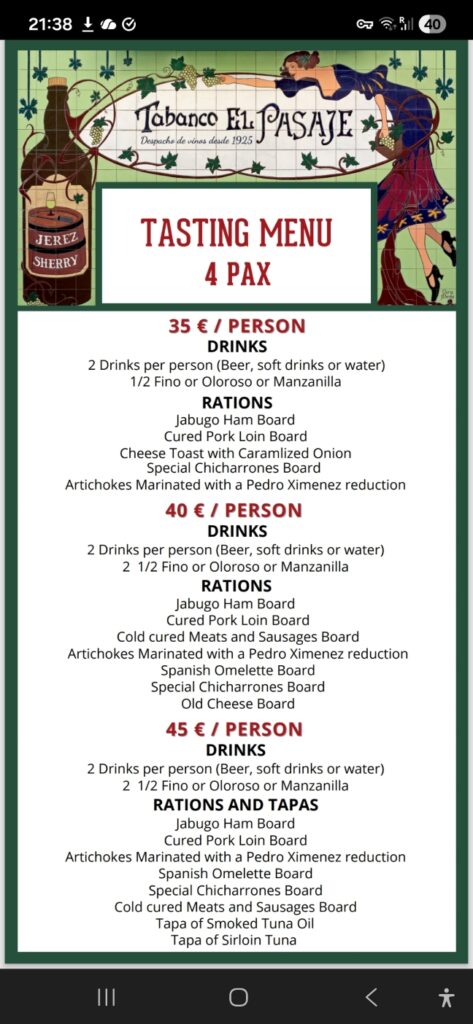 Vi har bifogat menyerna vi erbjuder för bord om 4 personer, men vi anpassar oss efter antalet personer. Du kan också beställa från menyn, men vid ett minimumköp på 35 euro per person ingår flamencoshowen.”