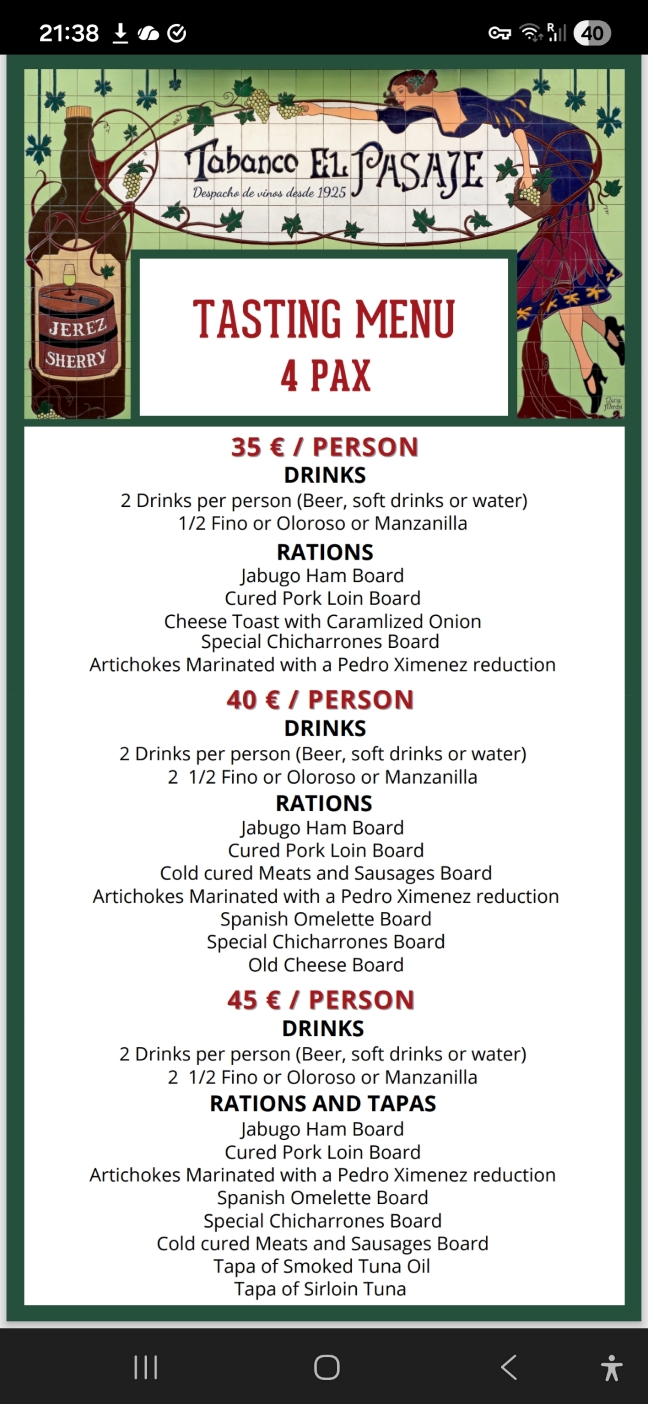 Vi har bifogat menyerna vi erbjuder för bord om 4 personer, men vi anpassar oss efter antalet personer. Du kan också beställa från menyn, men vid ett minimumköp på 35 euro per person ingår flamencoshowen.”