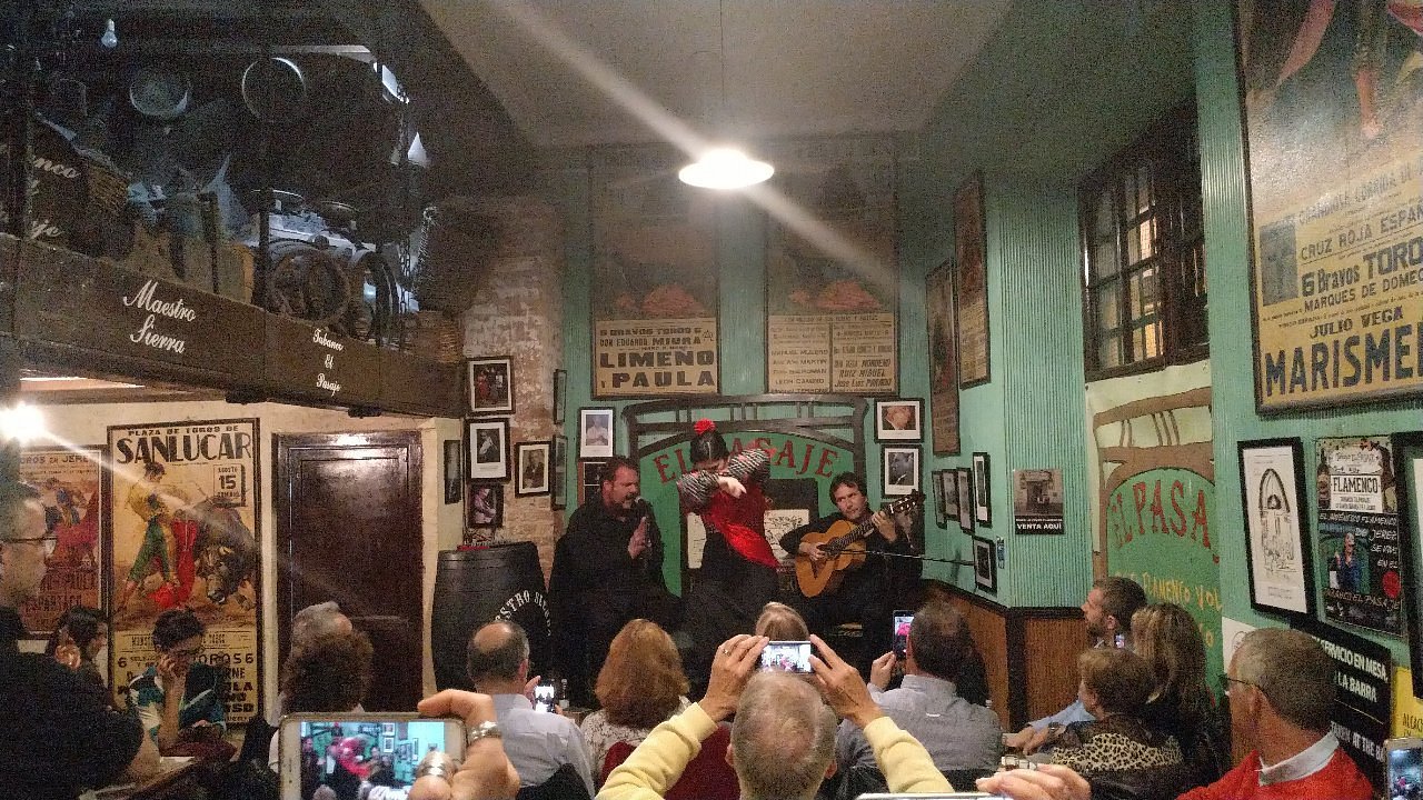 Ställena där man upplever flamencon, dricker vin och provar tapas är i området kända under namnet Tabancos. Så här presenteras Tabancos på Wikipedia: