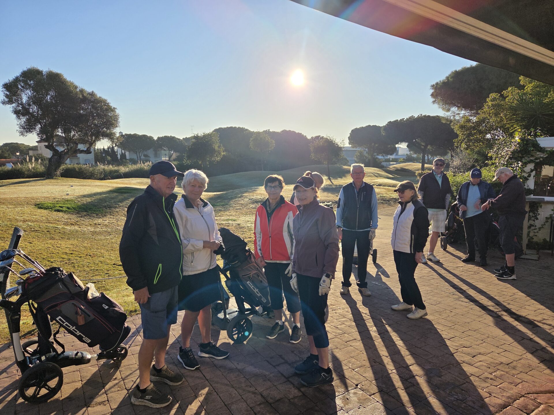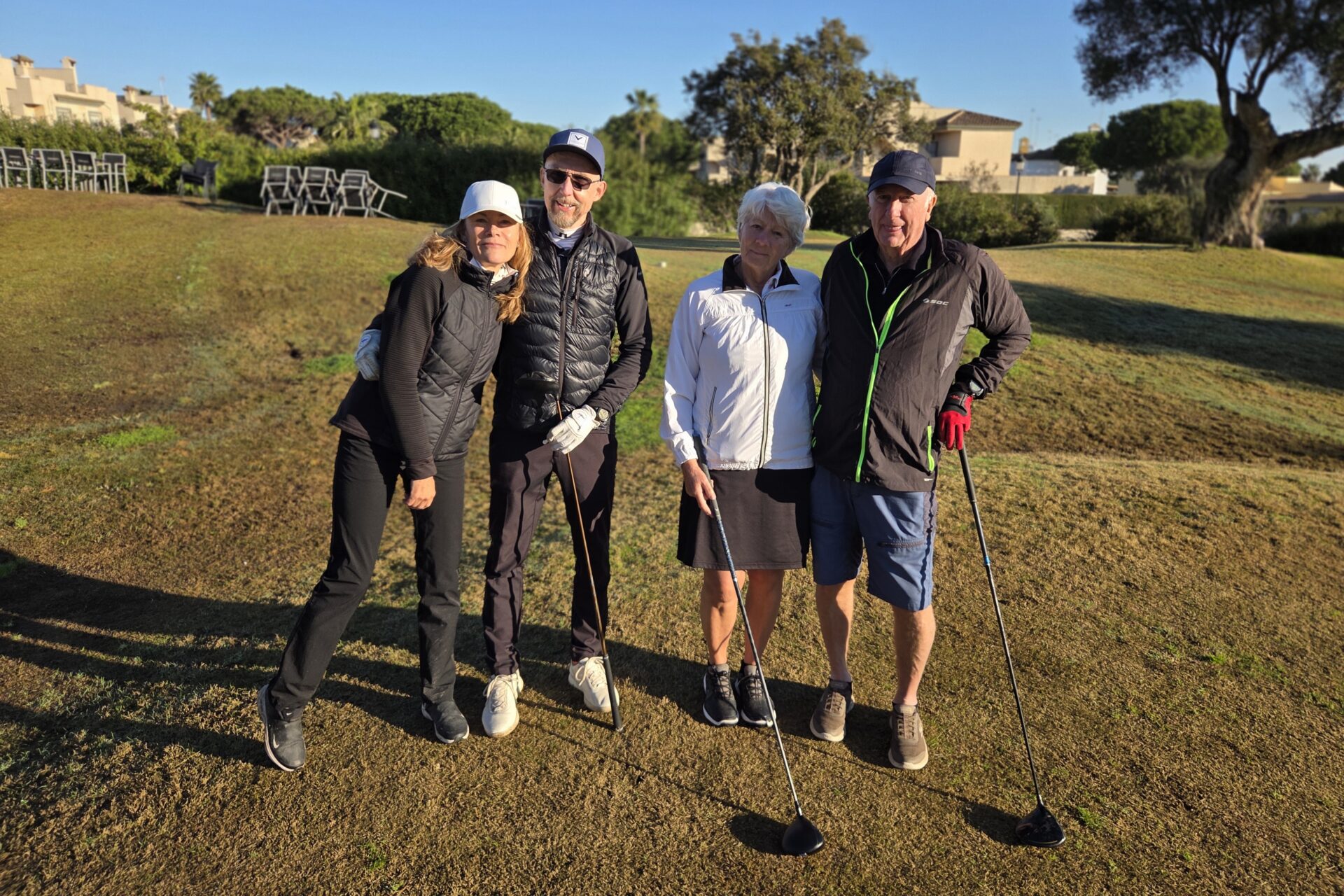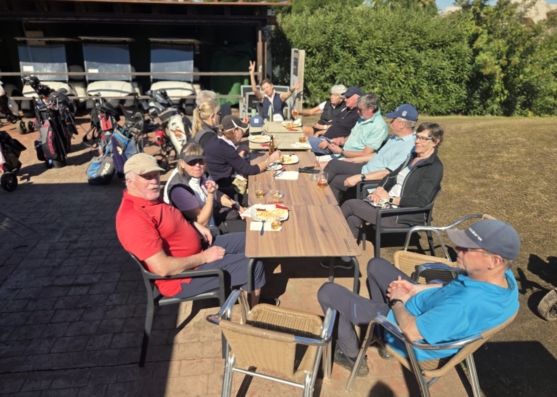 Morgondagg, blå himmel och sol. Gästerna är förväntansfulla innan dagens runda på Sancti Petri Hills.Ewa, Åsa, Håkan och Per-Åke känner varandra sedan tidigare och gick ihop på Hills.Likaså Torne, Ann, Tina och Bengt.Lena, Kenneth, Pia och Rolf ser fram emot en torrare runda.Själv fick jag äran att gå ihop med Peter och Hélèn.Jag såg bakgrunden och då blir det givetvis en bild.Efter rundan är det skönt med förfriskningar, anekdoter och en plats i solen.Fairways går parallellt och då kan man smygfotografera. Tack Åsa för bilden på Tina, Torne, Ann och Bengt.Åsa är numera känd här nere som ”hovleverantör” (läs håvleverantör). Håkan vill absolut ha tillbaka sina bollar, kosta vad det kosta vill. Tack Torne för bilden!