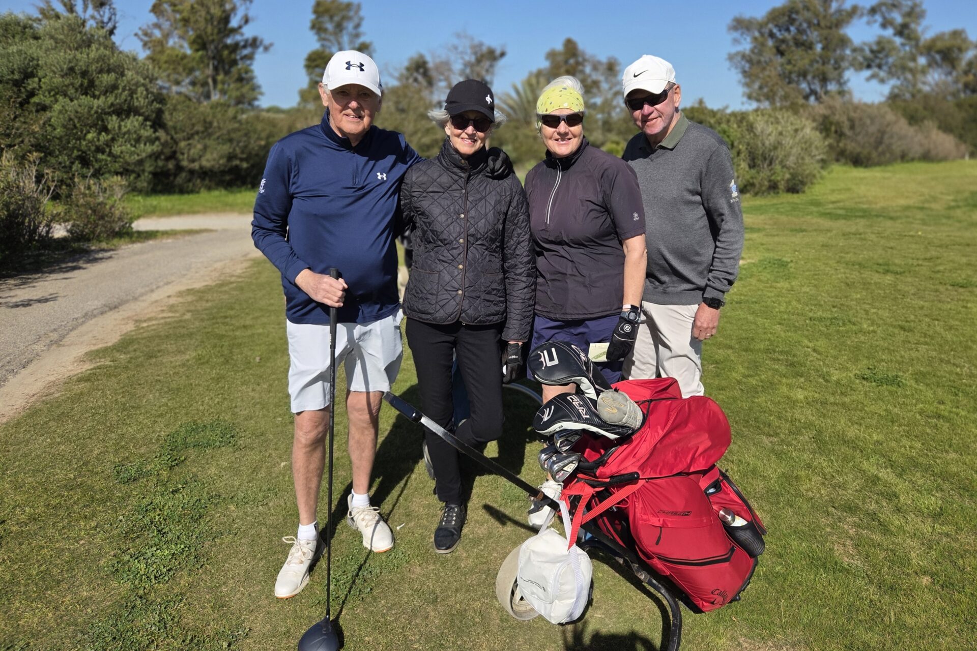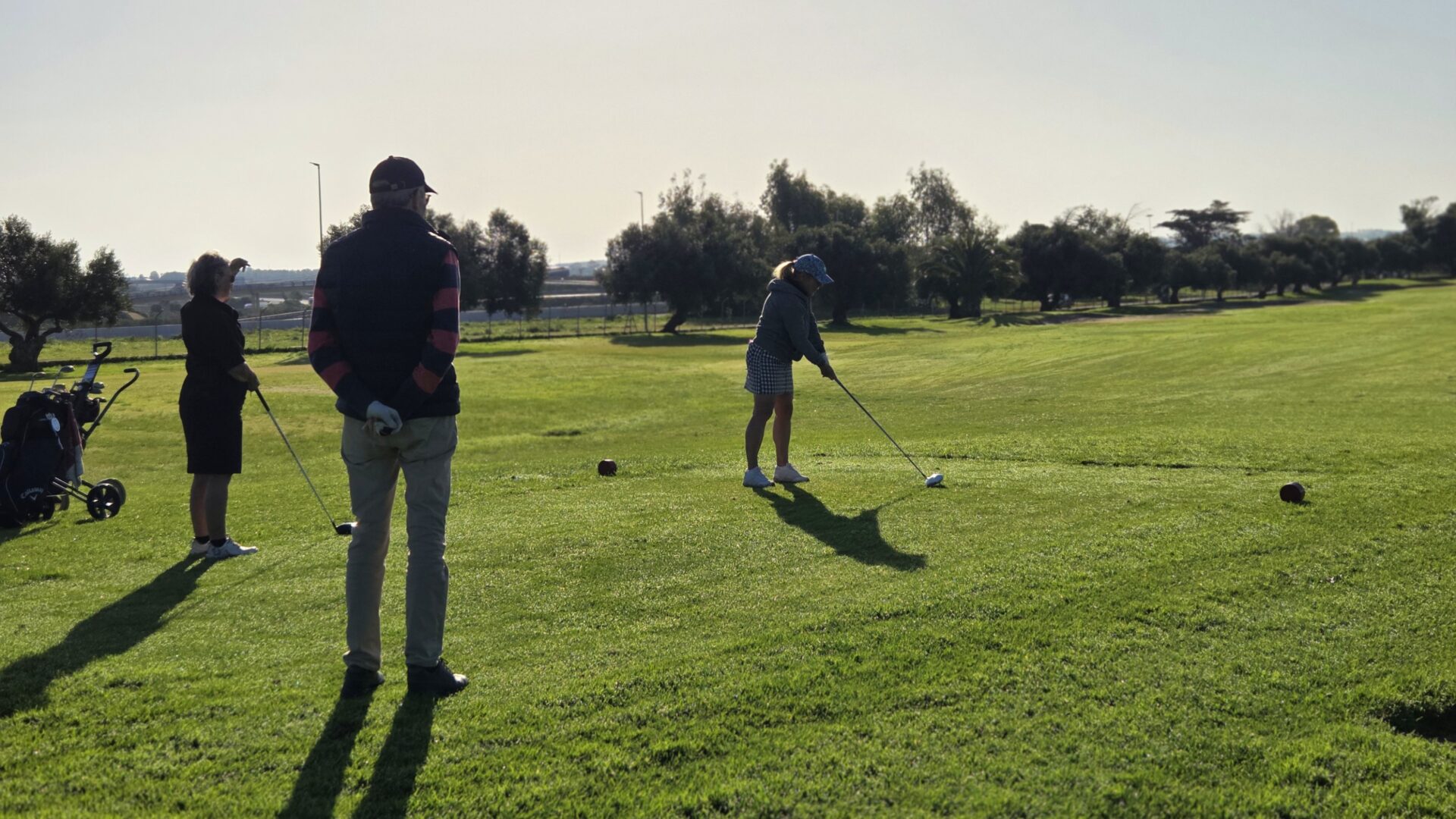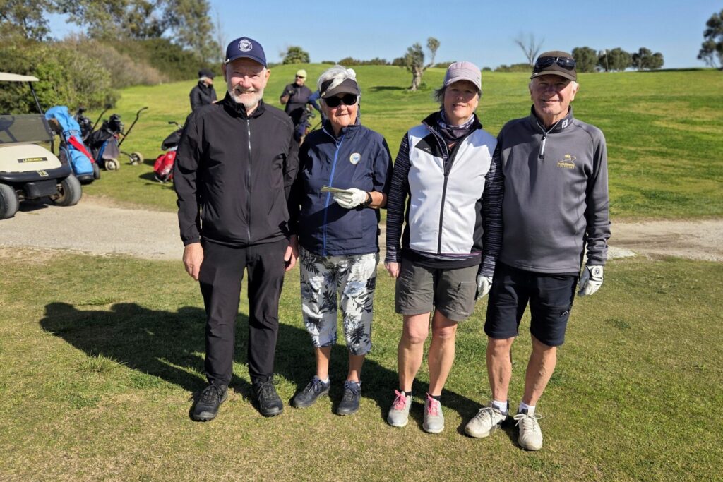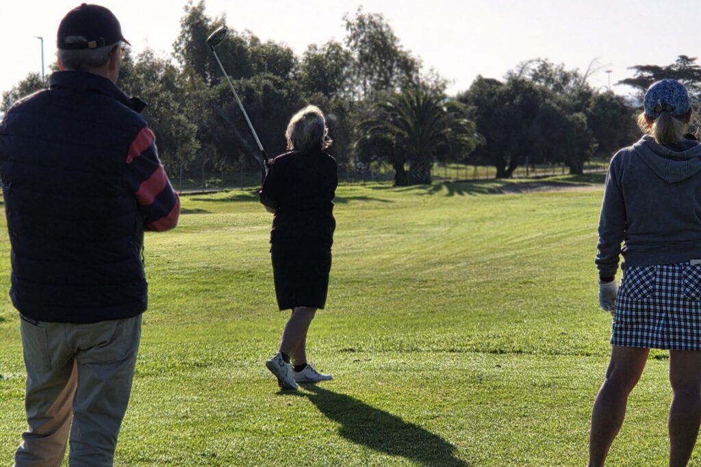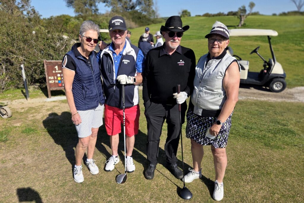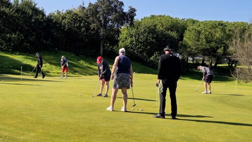 Vi fick lite nya gäster i veckan och de fick spela tillsammans med lite mer ”vana” spelare. Annika och Nisse visade vägen för Arne och Christina.Basse och Pia fick god vägledning av Yvonne och Göte på Campano.Claes och Inga-Lill tillsammans med nyanlända Ingrid och Hans.Den enda bilden jag lyckades med denna gemensamma middag var solnedgången på vägen dit. Magiskt!På La Estancia har man nu bytt polletter mot kortterminal på driving range. Som hemma!Nyblivna frugan Terttu kom på besök. Hon spelar inte golf men putta kan hon. Här fick Terttu låna putter av Claes.Dags för Bästboll. Yvonne och Göte ”vs” Claes och Inga-Lill.Lars-Eric och Solveig vs Pia och Basse.Arne och Christina vs Ingrid och Hans.Utanför tävlingen, Lena, Anders, undertecknad och Annika. Vid kameran Terttu som gick med.Easton Classic: Första laget ut Arne, Göte, Yvonne, Inga-Lill.Andra laget ut: Ingrid, Claes, Solveig och Basse.Tredje laget under Easton Classic: Lars-Eric, Pia, Hans och Christina.Utom tävlan och en boll som trivs med varandra. Lena slår ut och Annika och Anders tittar boll …Annika klämmer till och bollen är på fairway.