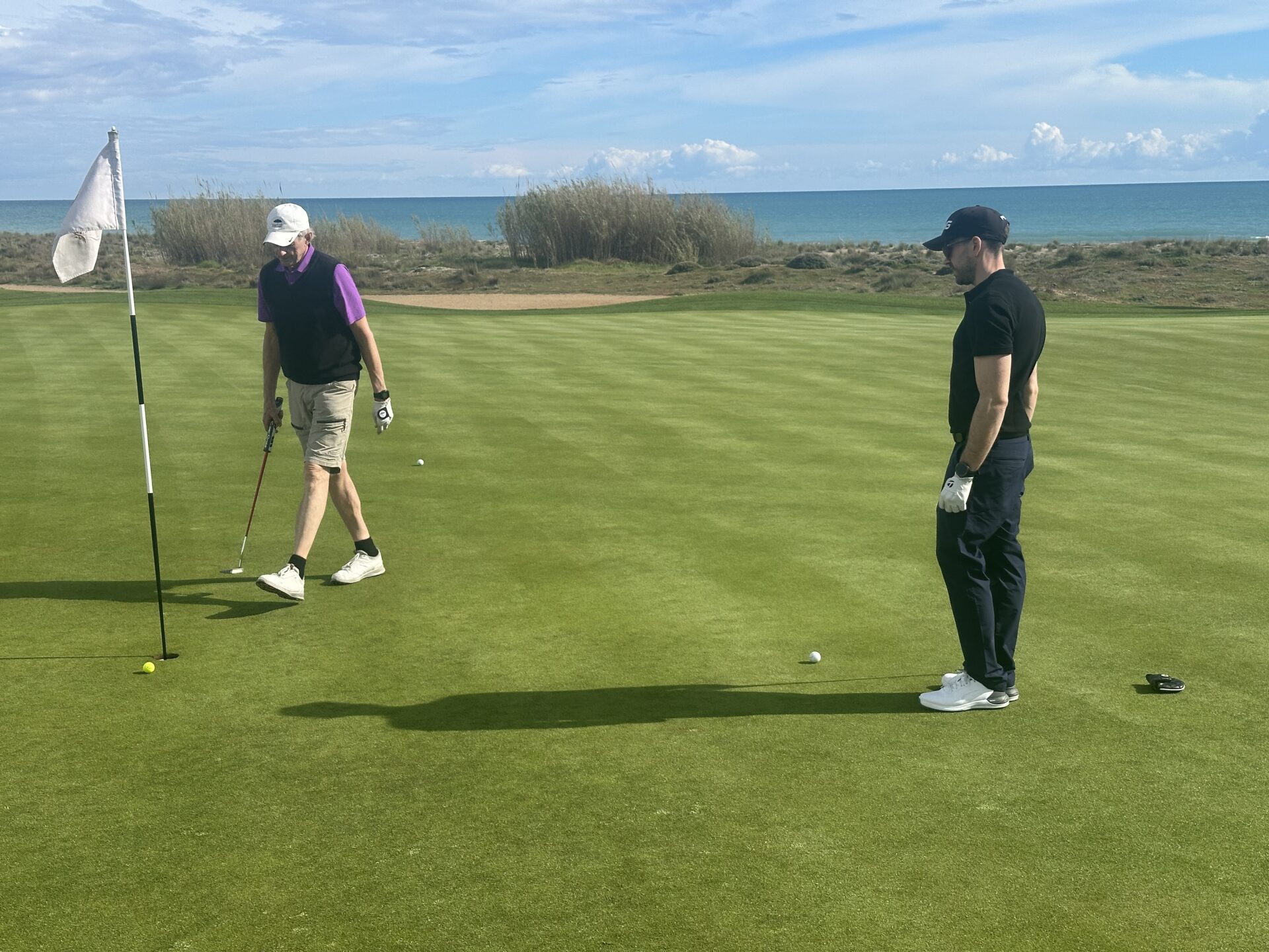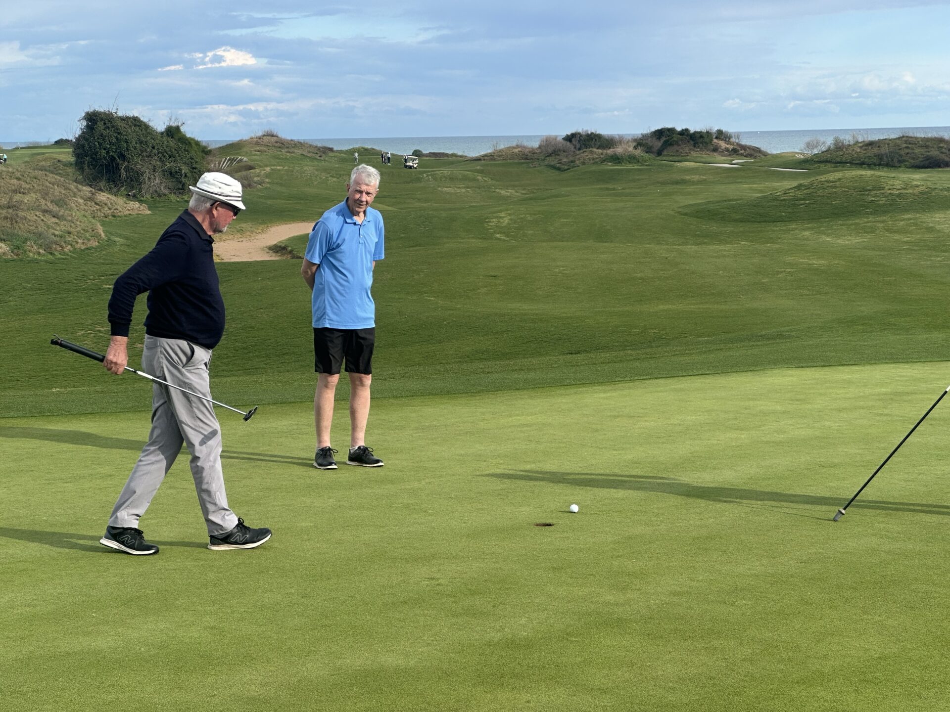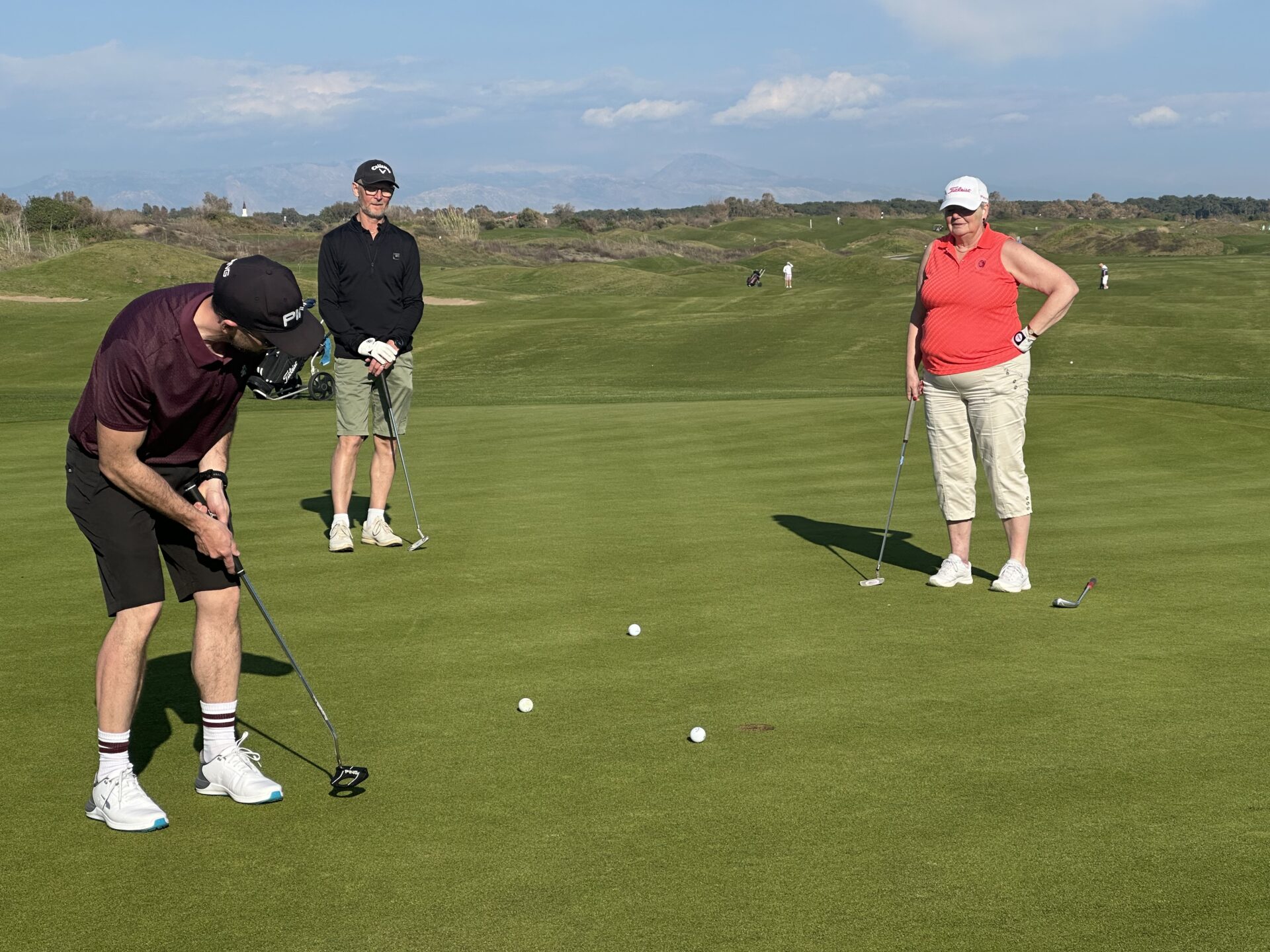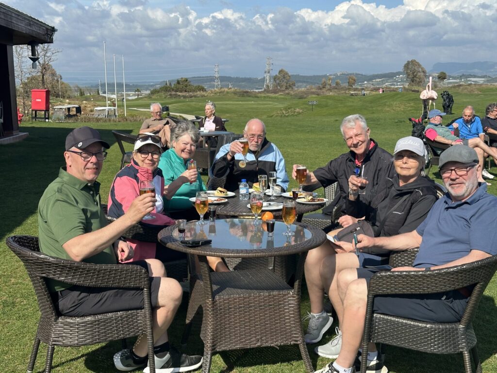 Det välförtjänta nittonde hålet gjorde ingen besviken – Anders, Eva, Anneli, Jan-Inge, Göran, Elisabeth och Stefan. Och där bakom myser Anders och Ingela i eftermiddagssolen!Singeltävling och Jan-Erik rundar koppen precis, med Göran som fascinerad åskådare.Kraftfull baksving hos Britt, borgar för både längd och riktning och poäng till laget i Easton Classic! Eva med bestämda steg på väg mot sin boll.Easton Classic Lag 4 – fokuserat kroppsspråk hos Andreas, bollen ser ut att vara på rätt väg! Lagkamraterna Hans och Anneli ser lugna ut!Den skulle ju i! Lars får nöja sig med bogey medan Andreas tar ut riktningen för sin putt.Thony Michaelsen Eastonvärd Lykia World Antalya